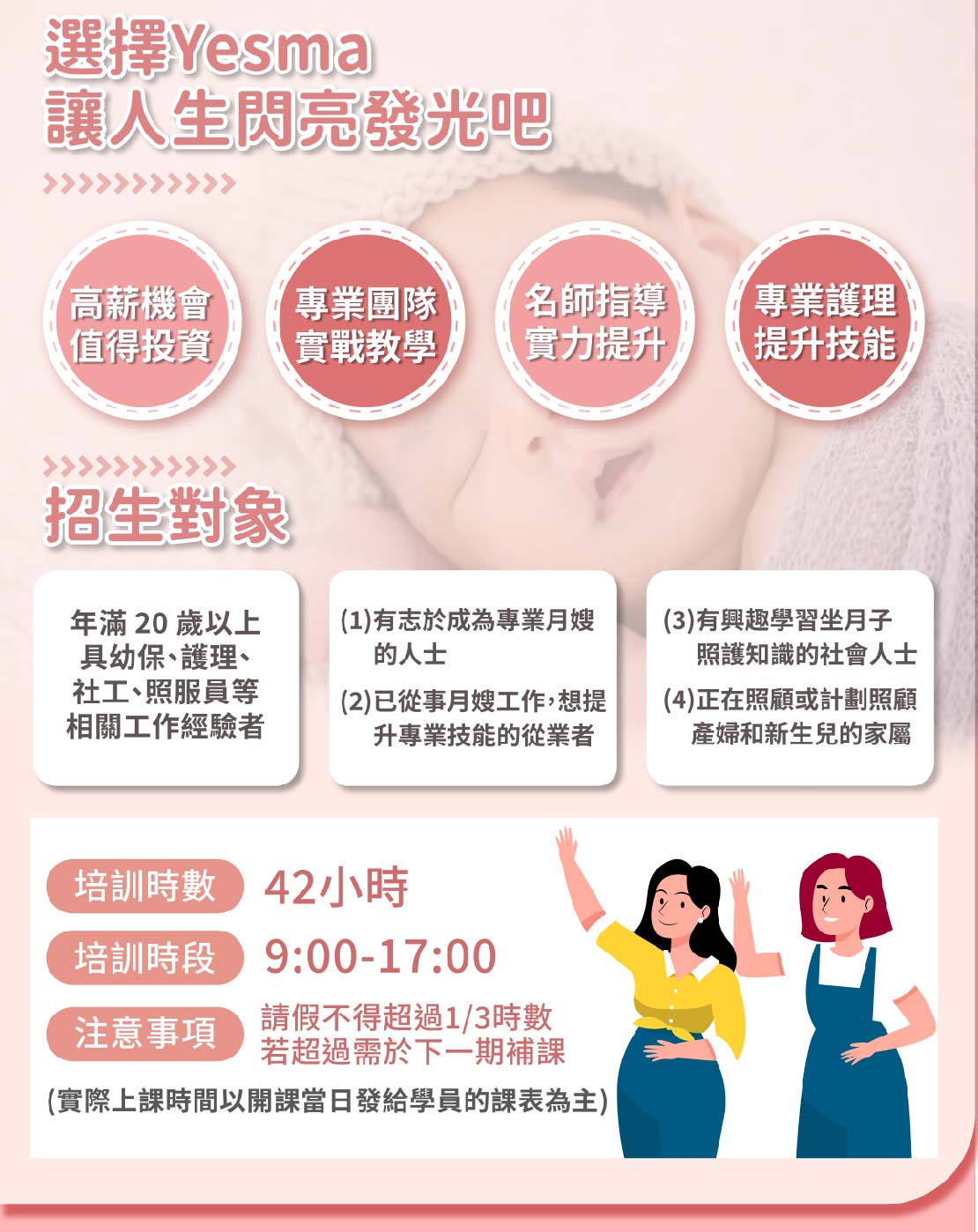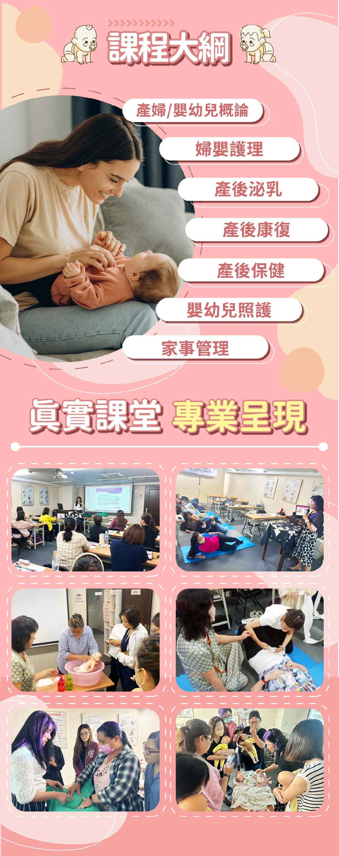 紮實培訓課程、業界最完善規劃、最有效果的學習、業界唯一,贈予月嫂服務流程實務課程!!