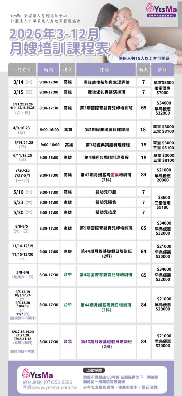 上課時間:2026年度 月嫂培訓課程