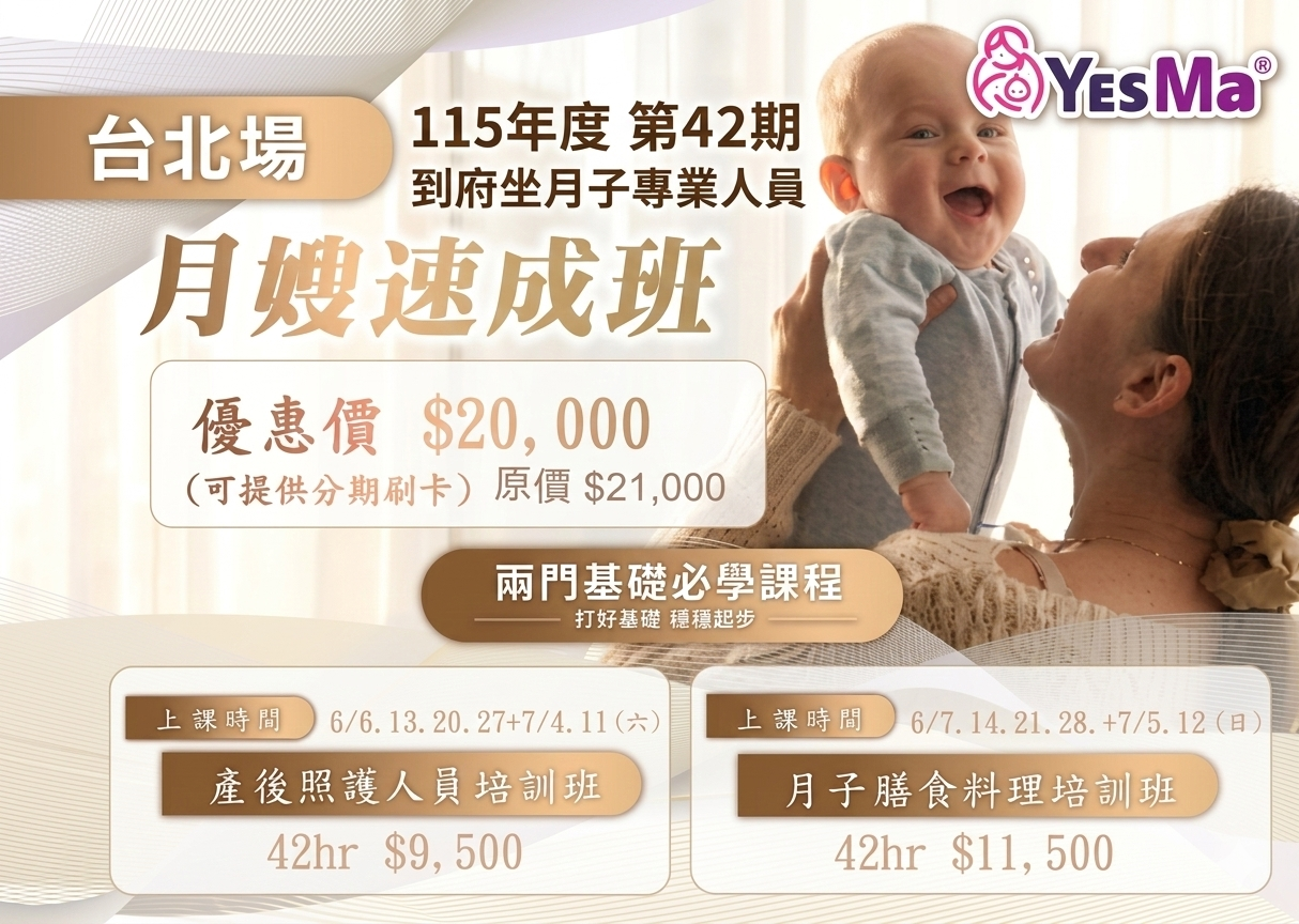 115年度『第42期-到府坐月子專業人員培訓班』台北班(假日班)6/6開課上課時間:2026/6/6.7.13.14.20.21.27.28.+7/4.5.11.12 共12堂...