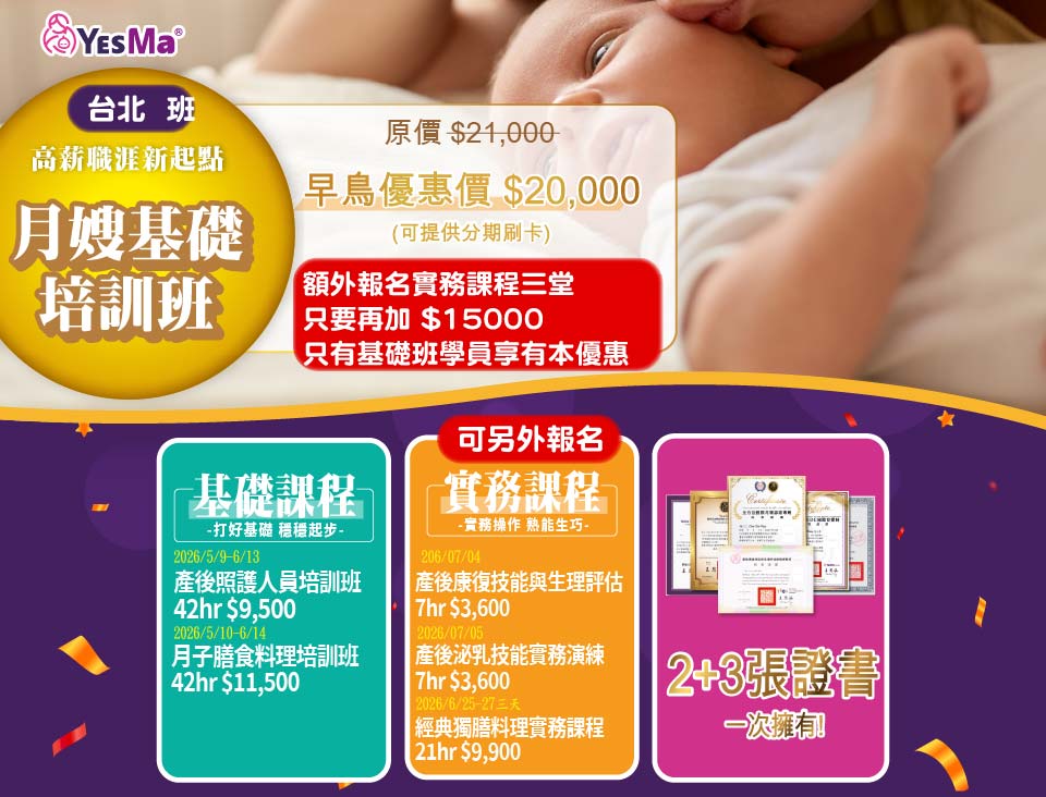 最夯的二度就業職場來了!! #坐月子專業人員培訓班來了!!紮實培訓課程、業界最完善規劃、最有效果的學習、業界唯一,贈予月嫂服務流程實務課程!!最順暢的轉職通路,就業媒合在這裡!!保證學習滿滿 荷包案件也滿滿哦!...
